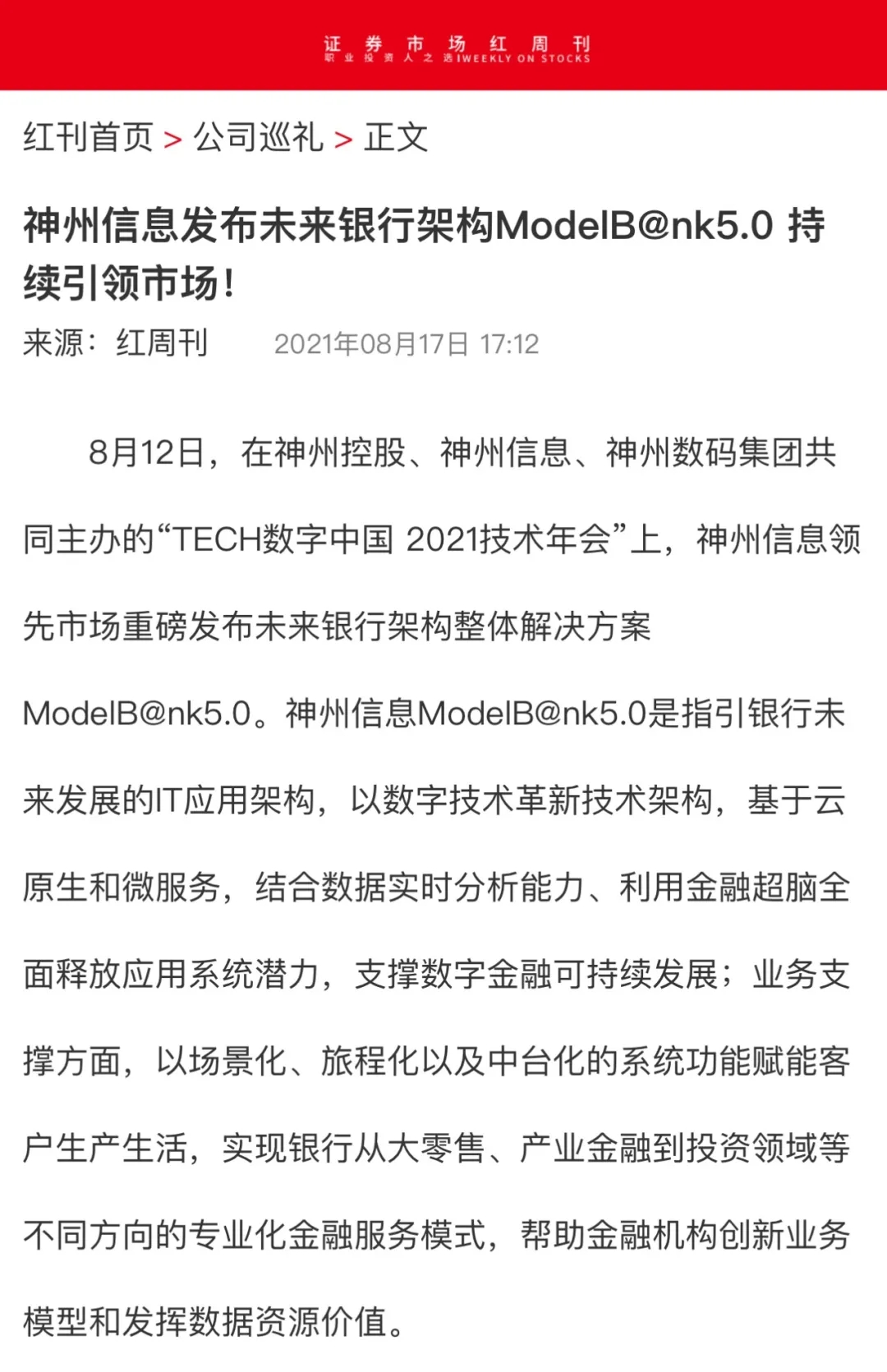 8月12日,由神州控股、BB贝博艾弗森官网、bb贝博艾弗森集团联合主办的“科技自强、数据融通、场景创新——TECH数字中国 2021技术年会”云上盛大启幕,发布神州信创云、ModelB@nk5.0、金融超脑Sm@rtFSB、云原生数字化安全底座、园区智能体等重磅产品,国内各大权威、影响力媒体多角度多频次对盛况进行报道!