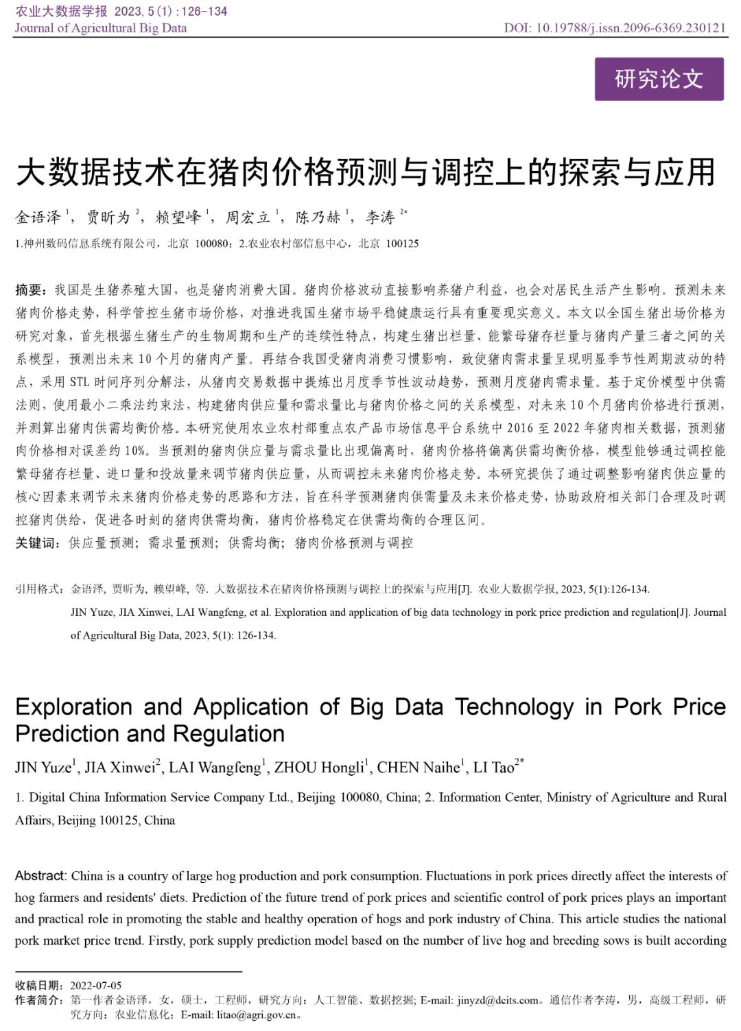 近日,BB贝博艾弗森官网在《农业大数据学报》 上发表题为《大数据技术在猪肉价格预测与调控上的探索与应用》的研究论文,一经发表便得到行业高度关注。
